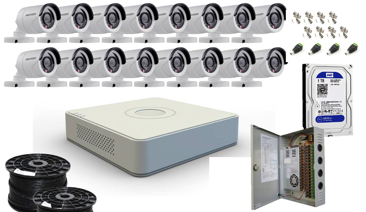 Hikvision 16 Channel TurboHD DVR with 1TB HDD & 16 Cameras DIY CCTV Kit 16 x Hikvision Outdoor 720p Infra-red Hybrid Turbo Bullet Camera: DS-2CE16C0T-IRPF - Analogue HD output - 4:1 Feature: TVI/AHD/CVI/CVBS - Smart IR, 20m distance - True Day/Night - DNR; 12 VDC - 1 x Hikvision 16-Channel 720P HD-TVI / Turbo DVR: - DS-7116HGHI-K1 - Supports HD-TVI & analogue cameras - Full channel recording at up to 1080P lite resolution - 1-Channel Audio in- /output - Hard disk: 1 SATA interface - HDMI/VGA output - 12 VDC 1 x WD Purple Surveillance, 1 TB 3.5" SATA Hard Drive 100 meter Cable RG59 Co-Axial 75ohm with 0.5mm 2 Pair, Black, High grade 1 x Power supply 9 channel 100w 8.3A 4 x Connector Female DC Jack with Terminals 8 x BNC Connector, 6mm crimp plug - Economical CCTV DIY kit with remote viewing via Google Store / Apple Store Hik-Connect app